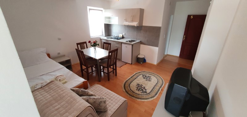 Apartman 5 se nalazi na prvom spratu i pogodan je za porodicu. Sadrži sve elemente za prijatan boravak u Sokobanji.