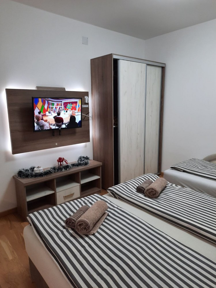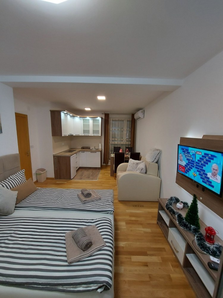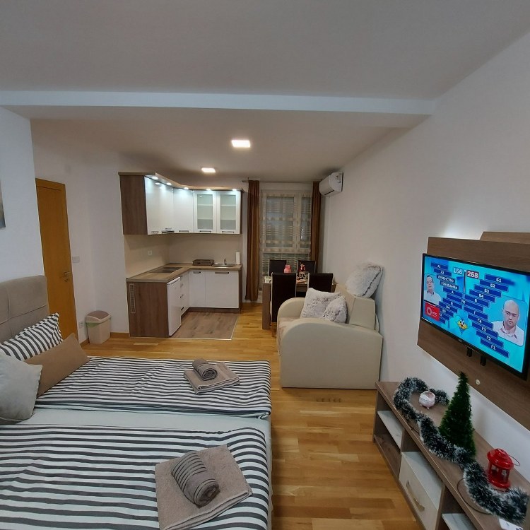 francuski ležaj, ležaj za jednu osobu i fotelju na razvlačenje, rashladni uređaj, indukcionu ploču, aspirator, TV uređaj, fen, peglu, dasku za peglanje i rasklapajući krevetac za bebe