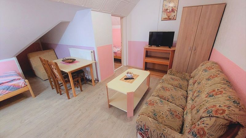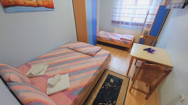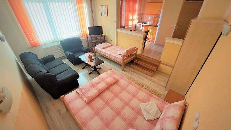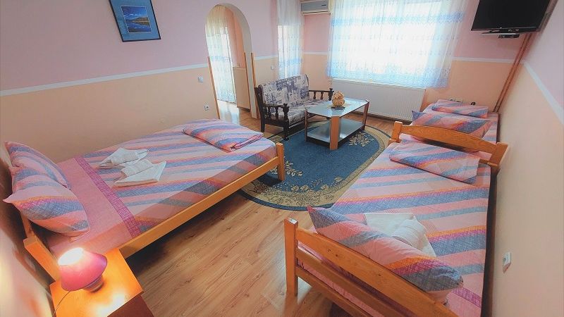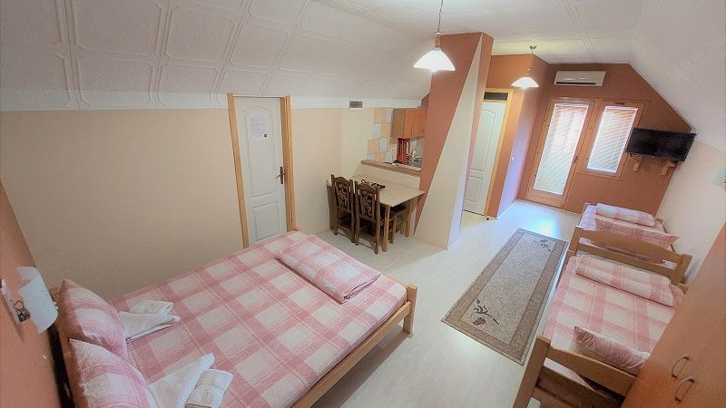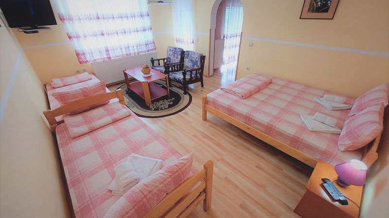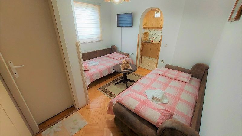 Veličina: 40m2 Broj ležajeva: 4 (francuski + 2 kreveta) + (po potrebi fotelja na rasklapanje)Dvosobni cetvorokrevetni Apartman ”PINK”. Apartman se nalazi na trecem spratu porodične kuće