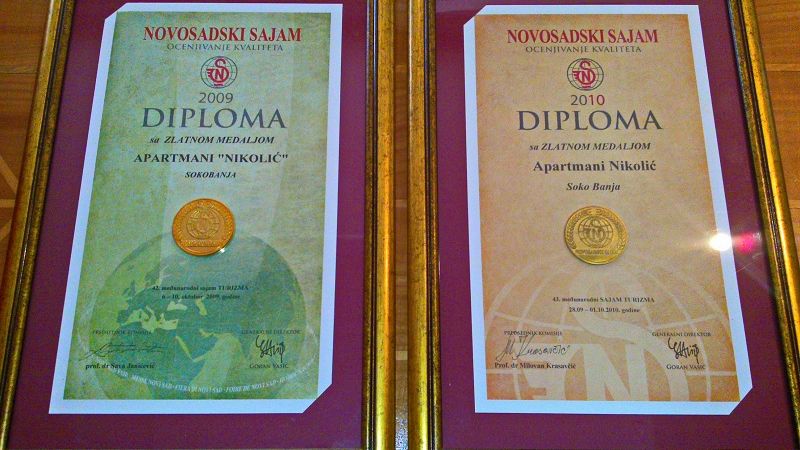 -dobitnik ZLATNE MEDALJE na 42. i 43.medjunarodnom sajmu turizma u Novom Sadu za najkvalitetniji privatni aparmantski smestaj za 2009. i 2010 godinu