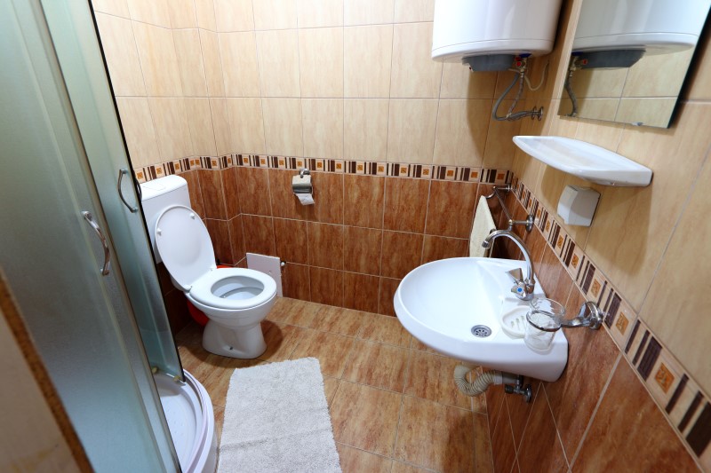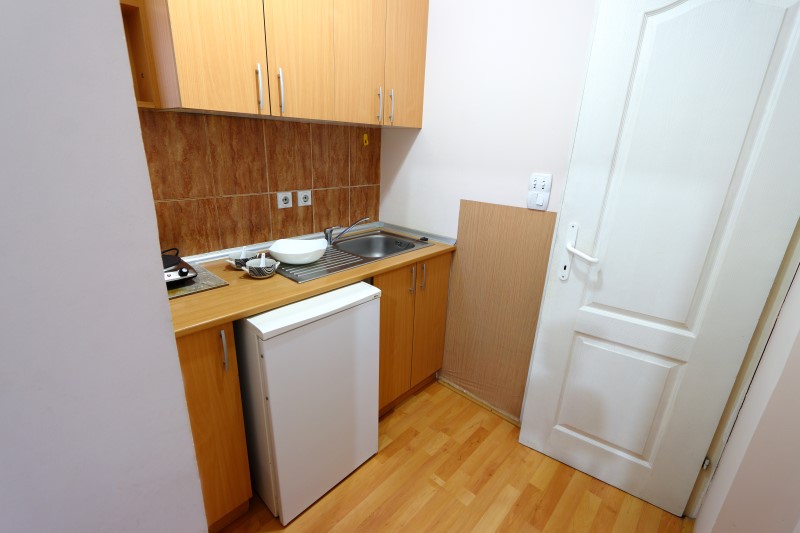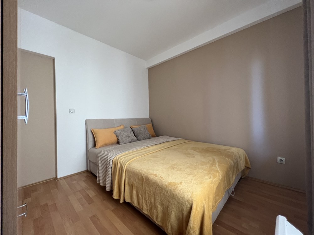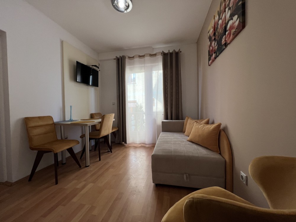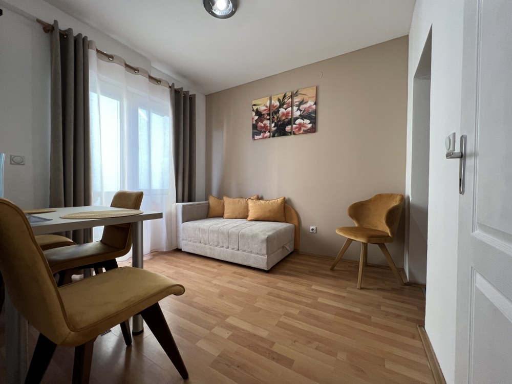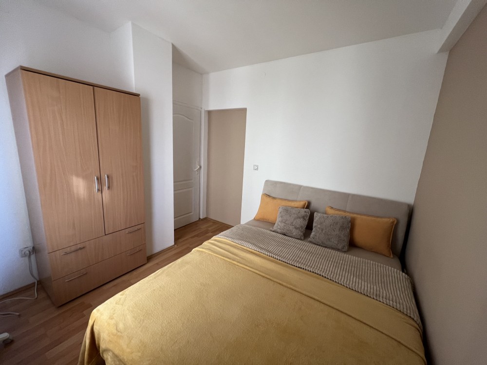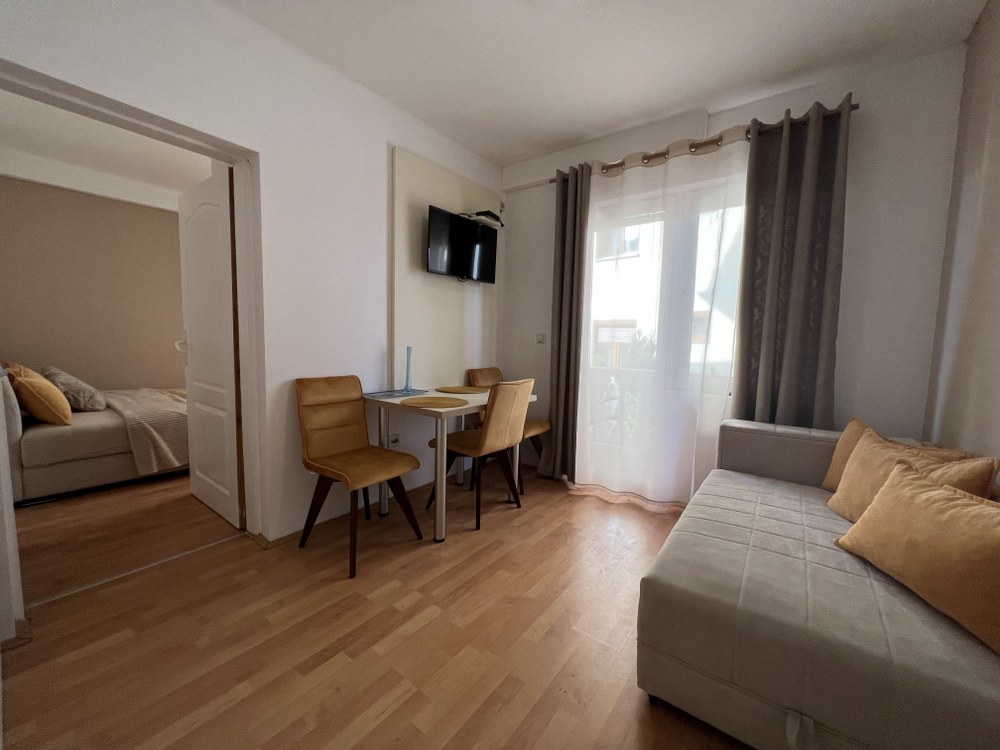 dve terase, jedna je povezana sa dnevnim boravkom, a druga sa spavaćom sobom. Spavaća soba poseduje francuski ležaj sa garderoberom. Dnevna soba poseduje GROF na razvlačenje za dvoje.Kuhinja sa trpezarijom i kupatilo. Poseduje KTV i parking obezbedjen u dvorištu.