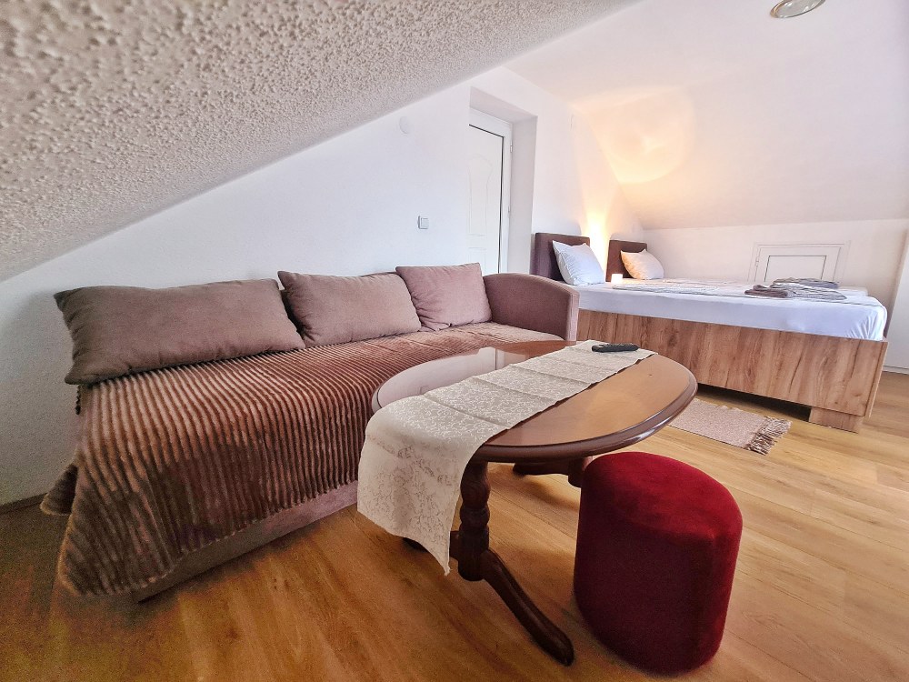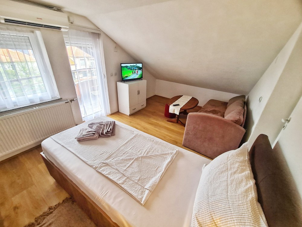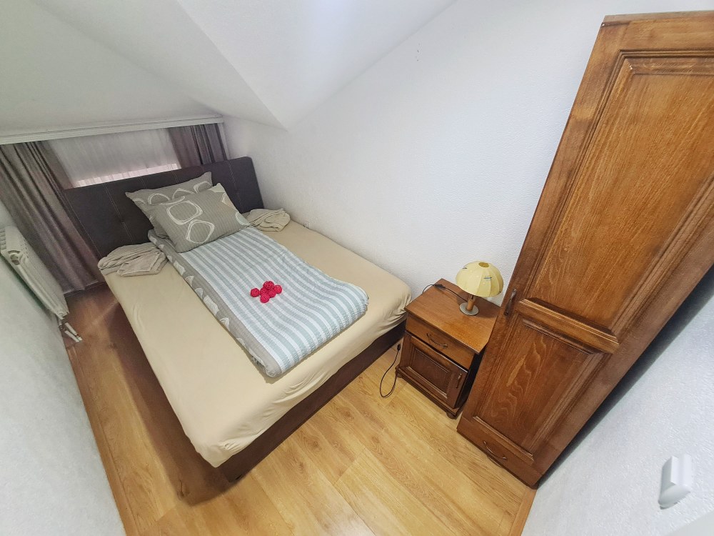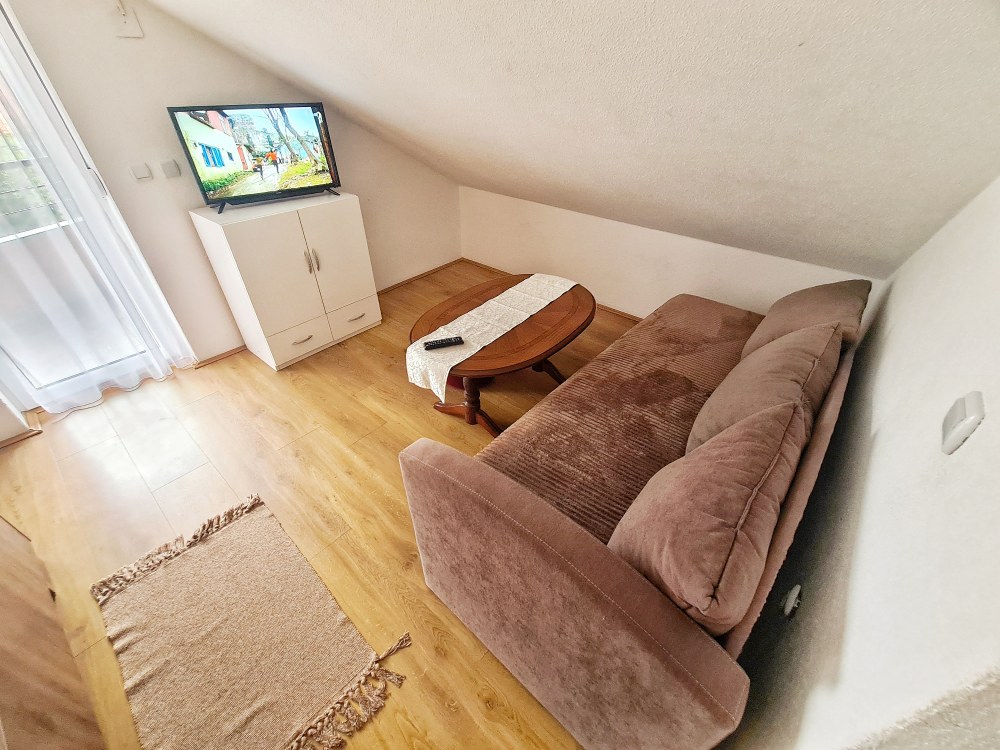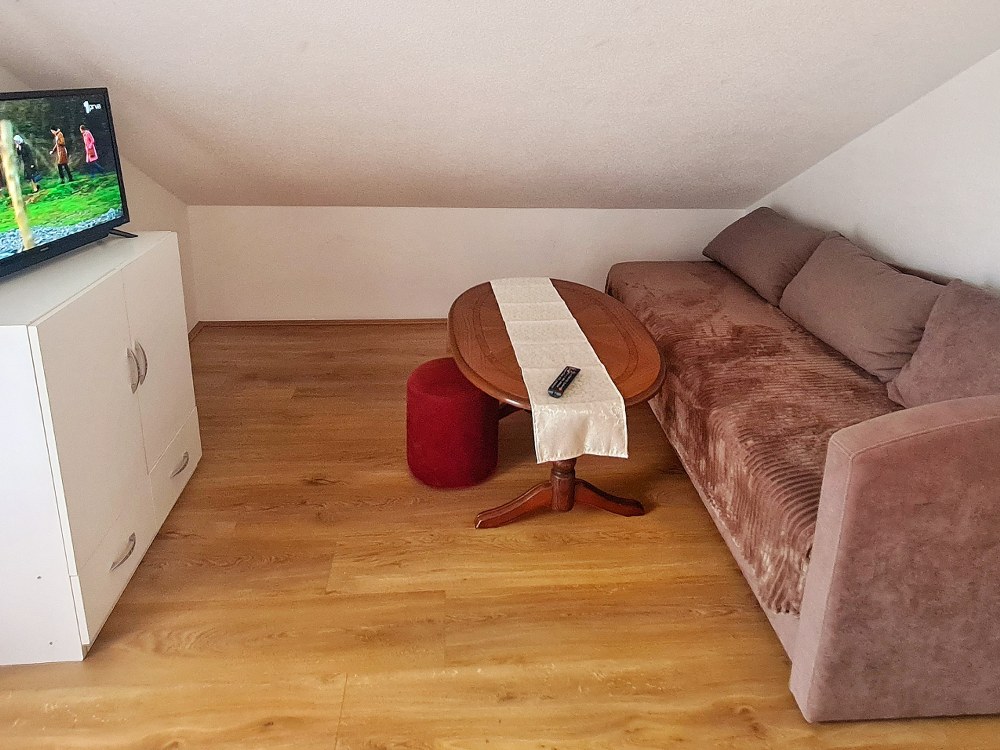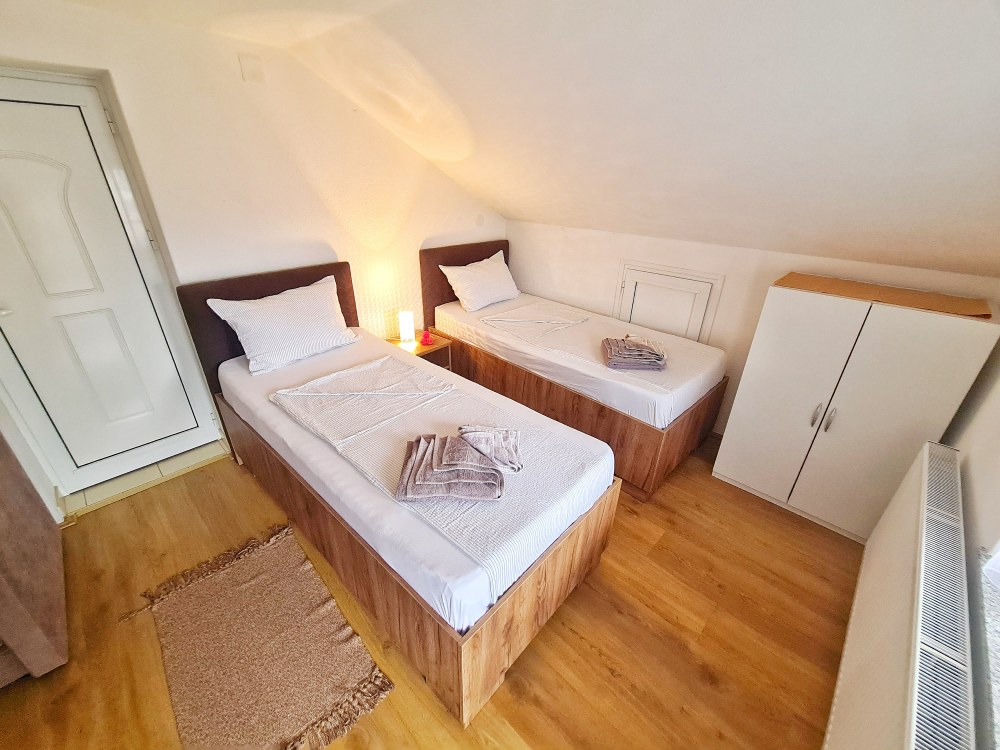 Unutrašnjost se sastoji od elegantne spavaće sobe opremljene francuskim ležajem, savršene za opuštajući san. Pored nje nalazi se dodatna soba za spavanje, osiguravajući dovoljno prostora za sve članove porodice ili prijatelje. Nisu izostavljeni ni moderni elementi za vašu zabavu i povezanost - u apartmanu su dostupna dva televizora kao i bežični internet koji će vam omogućiti da ostanete uvek povezani sa svetom.