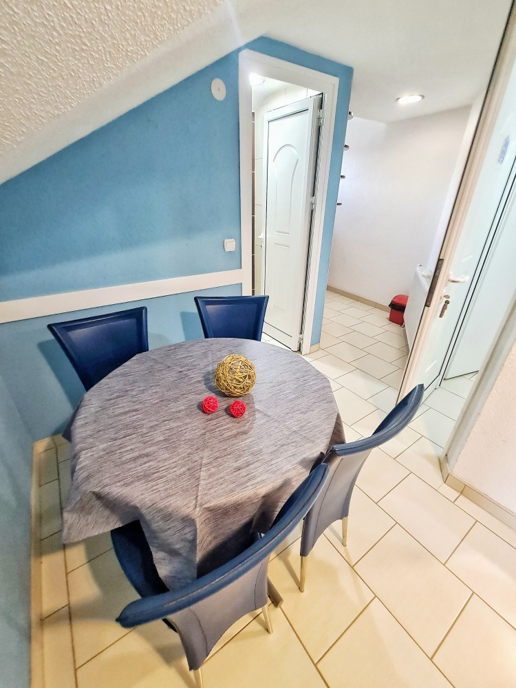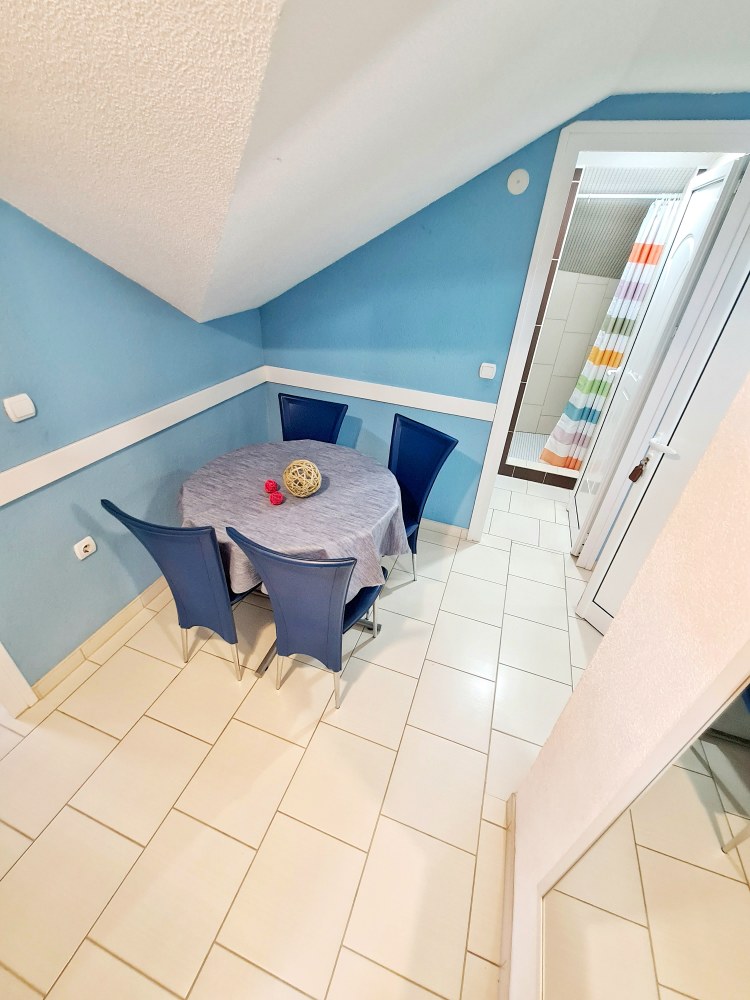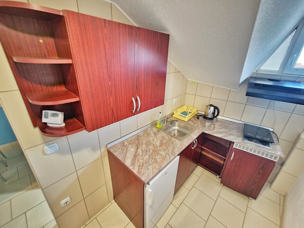 Kuhinja, spojena sa trpezarijom, opremljena je svim neophodnim sadržajima za pripremu i uživanje u obrocima, pružajući vam osećaj domaćinske atmosfere tokom boravka. Kupatilo je dizajnirano sa pažnjom na detalje, nudi sve pogodnosti potrebne za osveženje i opuštanje.