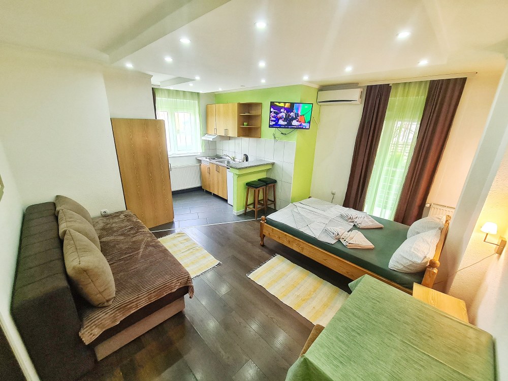 Studio 4 u Vili Aleksandra smešten je na prvom spratu i savršeno je opremljen za udoban boravak četiri osobe. Ovaj izuzetno funkcionalan studio nudi prostrani bračni krevet i praktičan kauč na rasklapanje, idealan za dodatne goste. Kuhinja je kompletno opremljena za pripremu obroka, dok moderno uređeno kupatilo pruža udobnost i eleganciju.