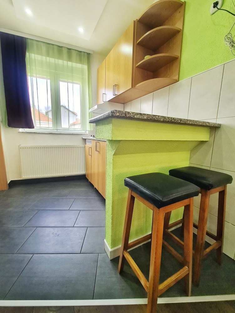 bračni krevet, kauč na arsklapanje, kuhinju, kupatilo, kablovsku TV, wireless internet i parking.