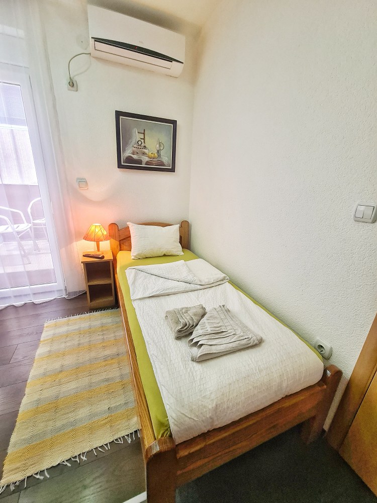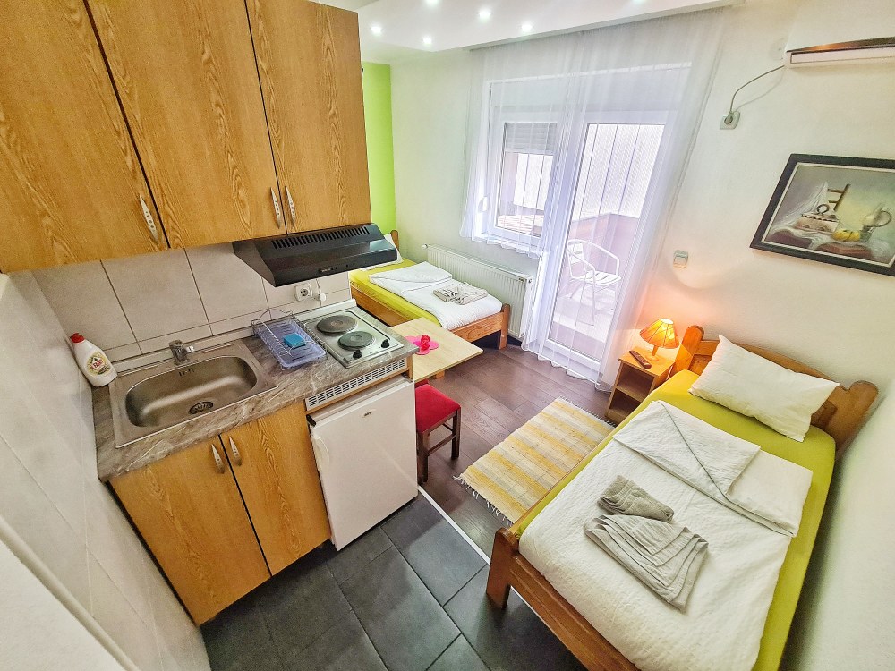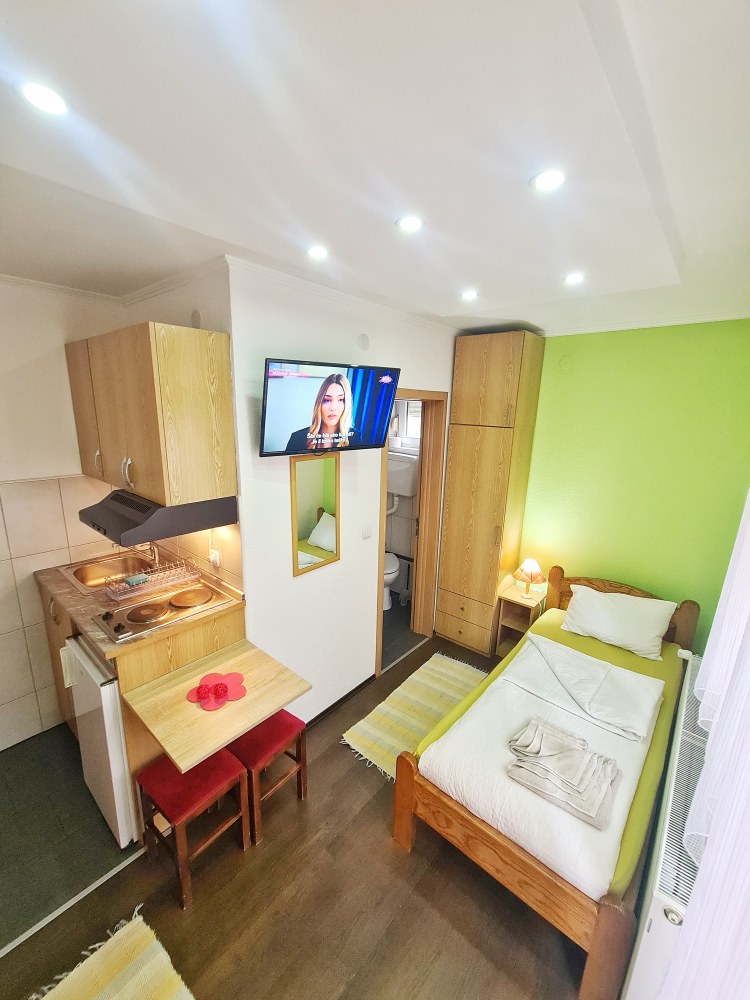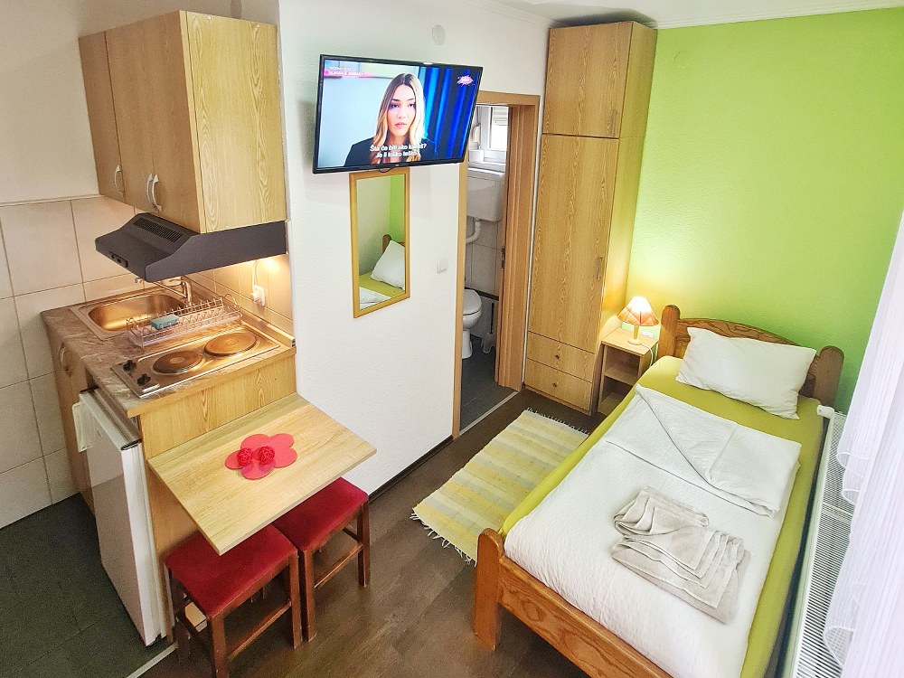 Studio 5, smešten na prvom spratu, idealan je izbor za dve odrasle osobe zahvaljujući udobnosti koju pružaju dva odvojena ležaja. Ovaj sofisticirani prostor uključuje potpuno opremljenu kuhinju, savremeno kupatilo, kablovsku TV za vašu zabavu, kao i besplatan bežični internet koji vam omogućava da ostanete povezani sa svetom. Uz to, na raspolaganju vam je i terasa za opuštanje na svežem vazduhu, kao i postrojen parking za vaša vozila.